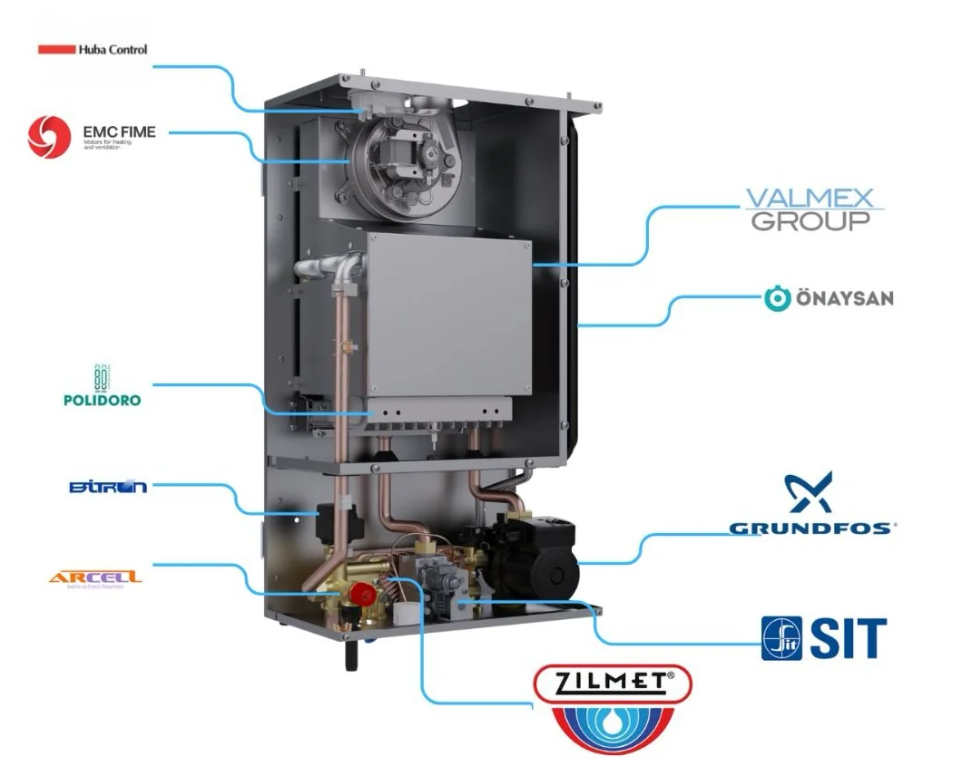 Yüksek ısı transferi sağlayan paslanmaz eşanjör yapısı, uzun ömürlü kullanım ve yüksek verim sunar.